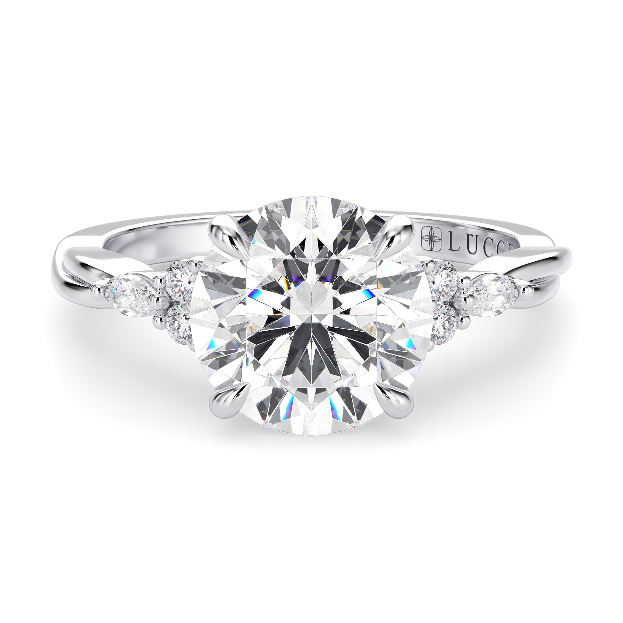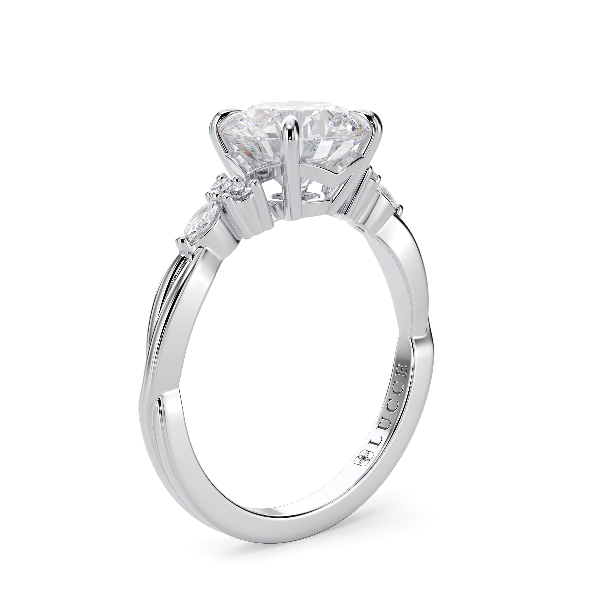 This forever piece features a low-profile setting, delicate cluster accents, and a graceful twisting band. Set with seven stones, this round-cut diamond engagement ring symbolizes that she is your perfect one, the missing piece that completes you. The twisting band speaks of your infinite love, a vow to stand beside her through every twist, turn, and chapter life brings.