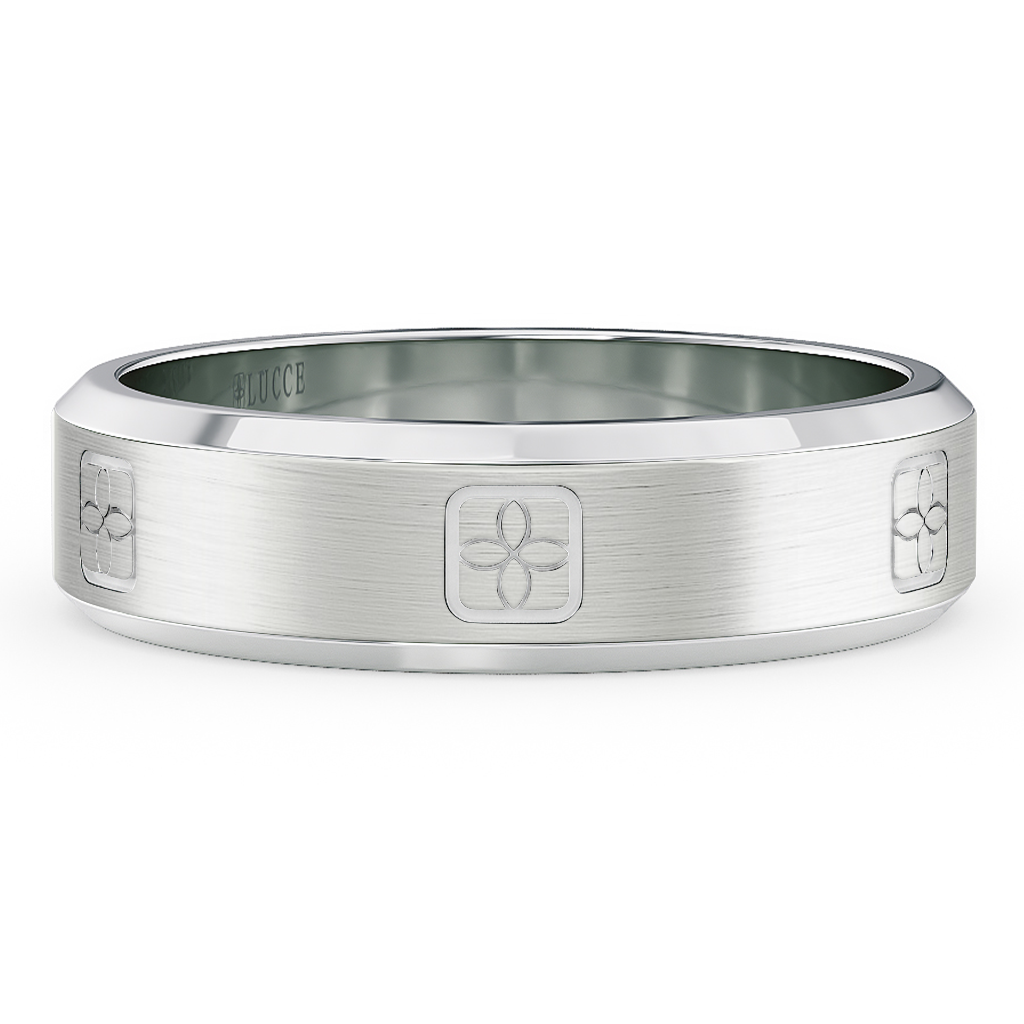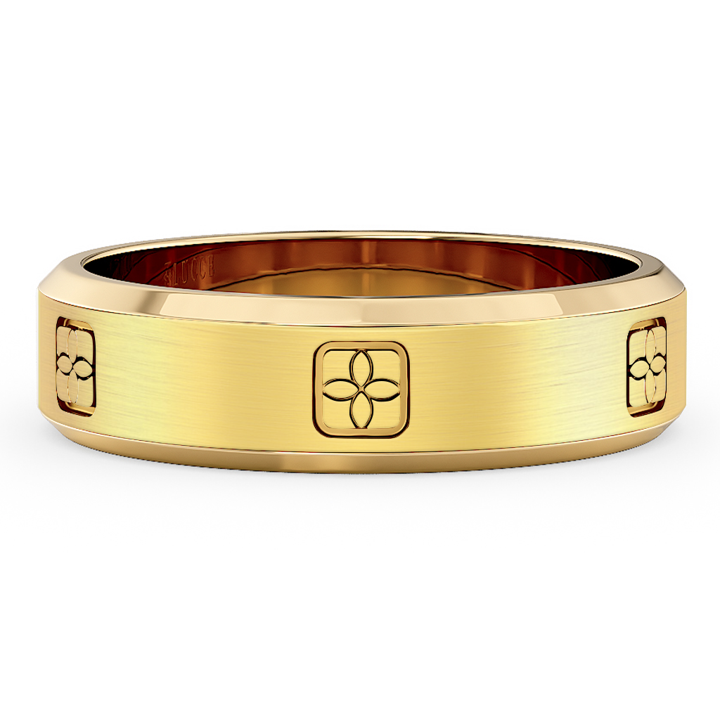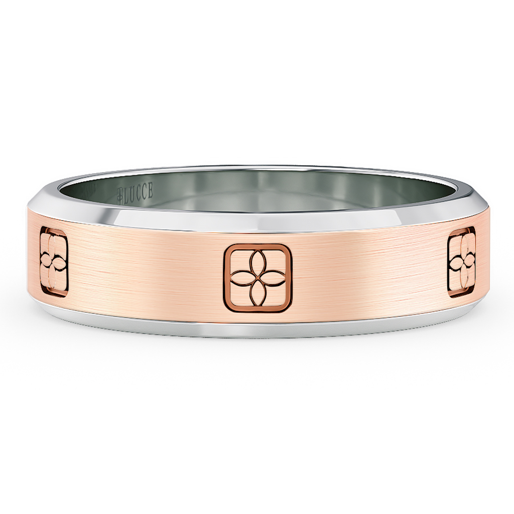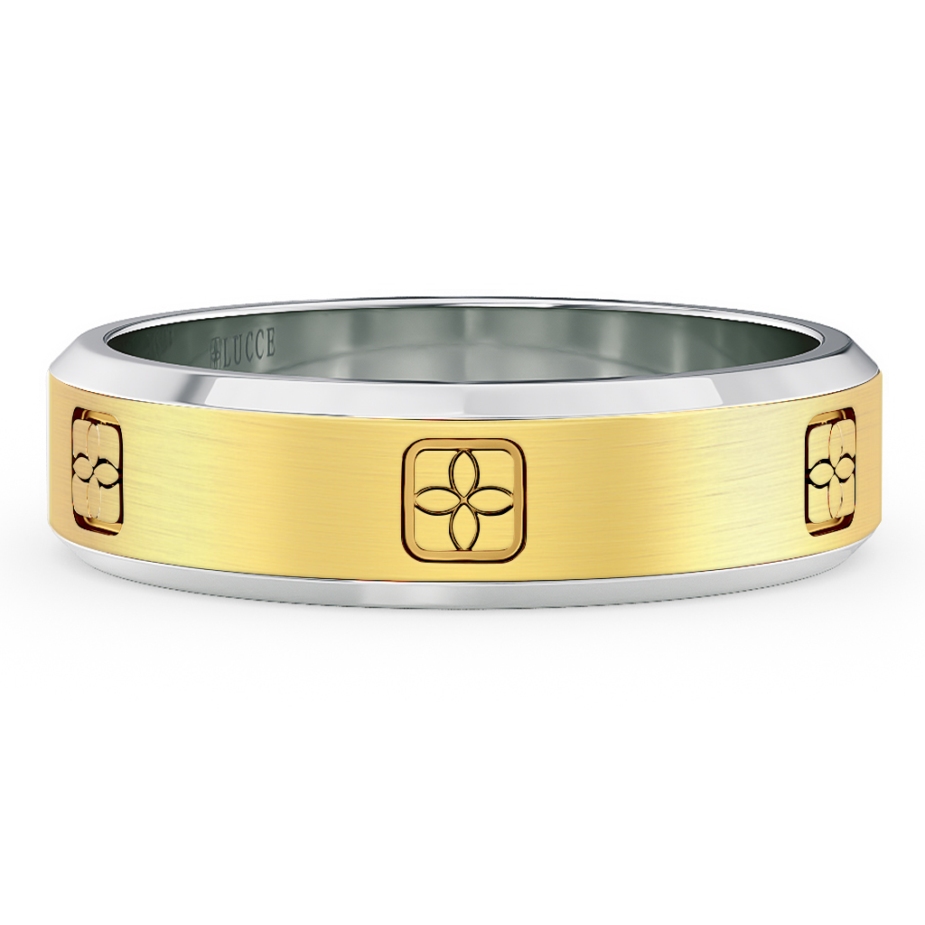 Showcase your love's unwavering commitment with the Constance Il Two-toned Band. This timeless piece features an engraved four-petal flower surrounded by a cushion-shaped frame, inspired by Lucce's iconic emblem. It is perfectly made for a love that is constant just like yours.
