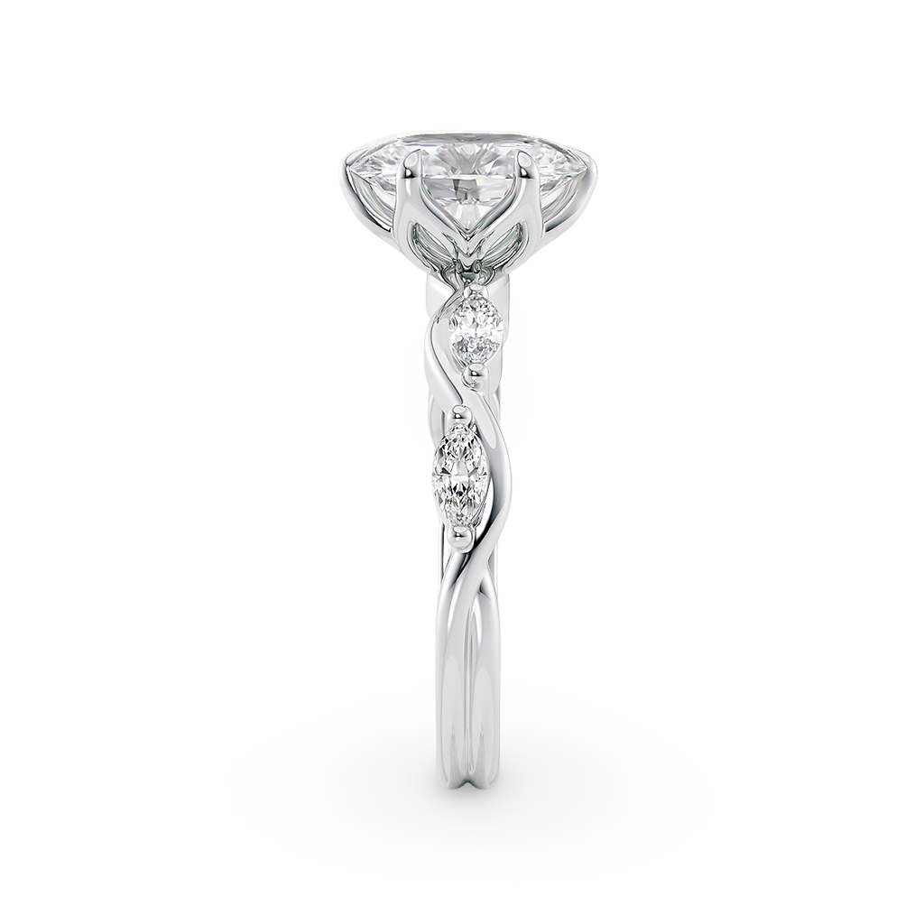 This forever piece features Lucce’s signature petal prongs and marquise-cut diamonds nestled in graceful, twisting vines. This oval cut diamond engagement ring's six delicate petal prongs symbolize her beauty, like a flower in eternal bloom, capturing the grace, warmth, and gentle strength that make her truly unforgettable. The marquise diamonds in twisting vines form an infinity design, representing a love that is forever true and constant through all times.