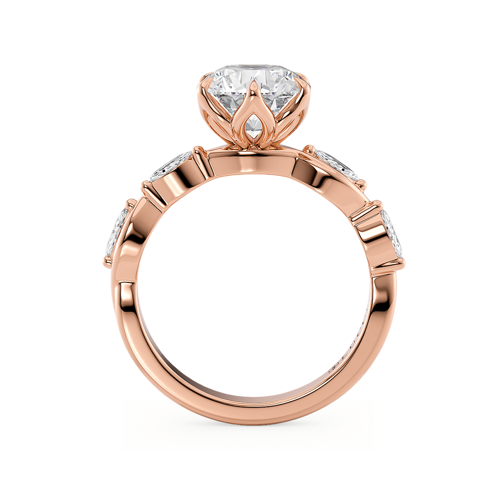 This forever piece features Lucce’s signature petal prongs and marquise-cut diamonds nestled in graceful, twisting vines. This round cut diamond engagement ring's delicate petal prongs symbolize her beauty, like a flower in eternal bloom, capturing the grace, warmth, and gentle strength that make her truly unforgettable. The marquise diamonds in twisting vines form an infinity design, representing a love that is forever true and constant through all times.