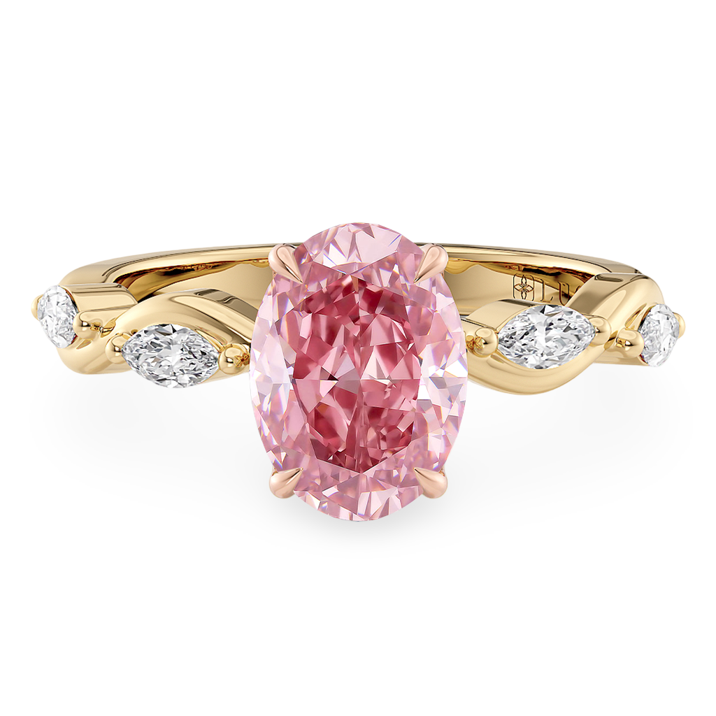 This forever piece features Lucce’s signature petal prongs and marquise-cut diamonds nestled in graceful, twisting vines. This oval cut pink diamond engagement ring's four delicate petal prongs symbolize her beauty, like a flower in eternal bloom, capturing the grace, warmth, and gentle strength that make her truly unforgettable. The marquise diamonds in twisting vines form an infinity design, representing a love that is forever true and constant through all times.