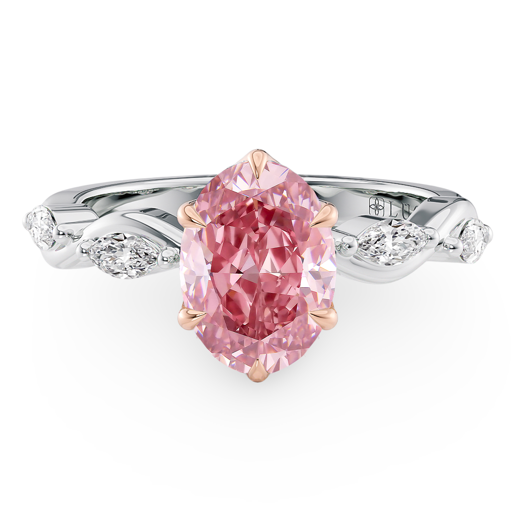 This forever piece features Lucce’s signature petal prongs and marquise-cut diamonds nestled in graceful, twisting vines. This oval cut pink diamond engagement ring's six delicate petal prongs symbolize her beauty, like a flower in eternal bloom, capturing the grace, warmth, and gentle strength that make her truly unforgettable. The marquise diamonds in twisting vines form an infinity design, representing a love that is forever true and constant through all times.