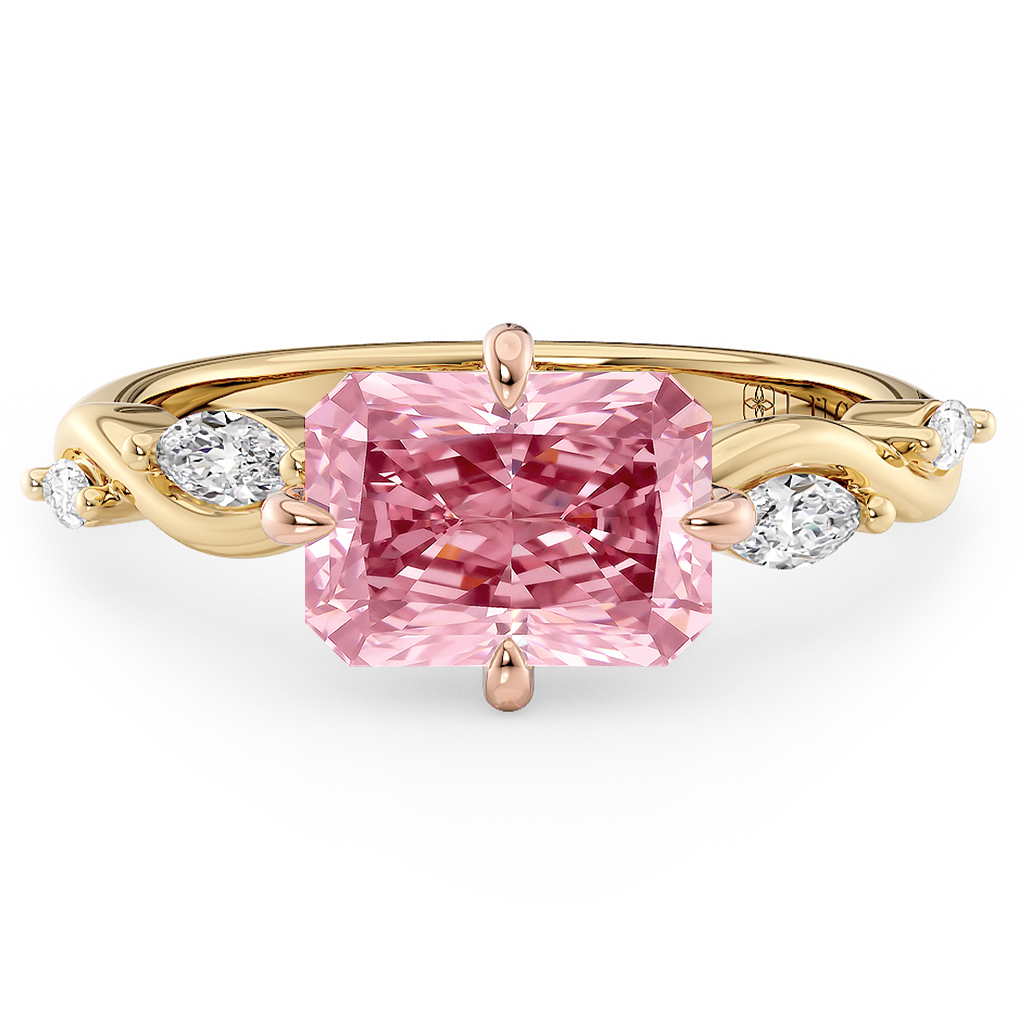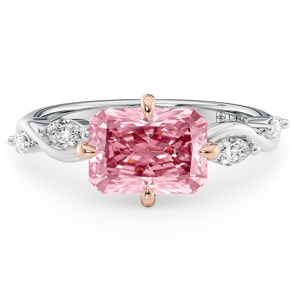 This forever piece features a low profile, east-west setting and marquise-cut diamonds nestled in twisting vines, elements that echo Lucce’s iconic emblem. This radiant cut pink diamond engagement ring's low setting mirrors the kind of love you share, quiet and grounded yet full of depth and meaning. The marquise diamonds in twisting vines form an infinity design, representing a love that is forever true and constant through all times.