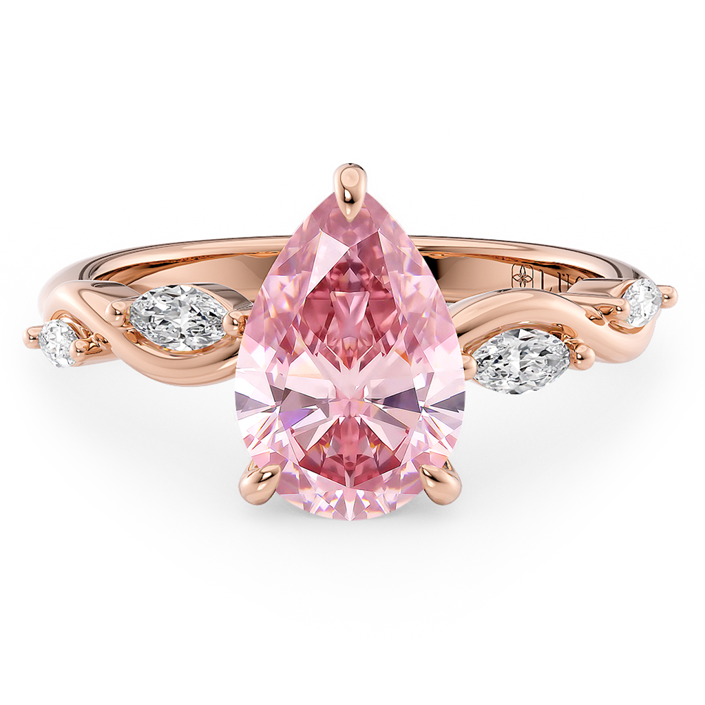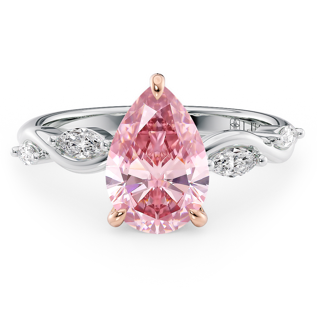 This forever piece features a low profile setting and marquise-cut diamonds nestled in twisting vines, elements that echo Lucce’s iconic emblem. This pear cut pink diamond engagement ring's low setting mirrors the kind of love you share, quiet and grounded yet full of depth and meaning. The marquise diamonds in twisting vines form an infinity design, representing a love that is forever true and constant through all times.