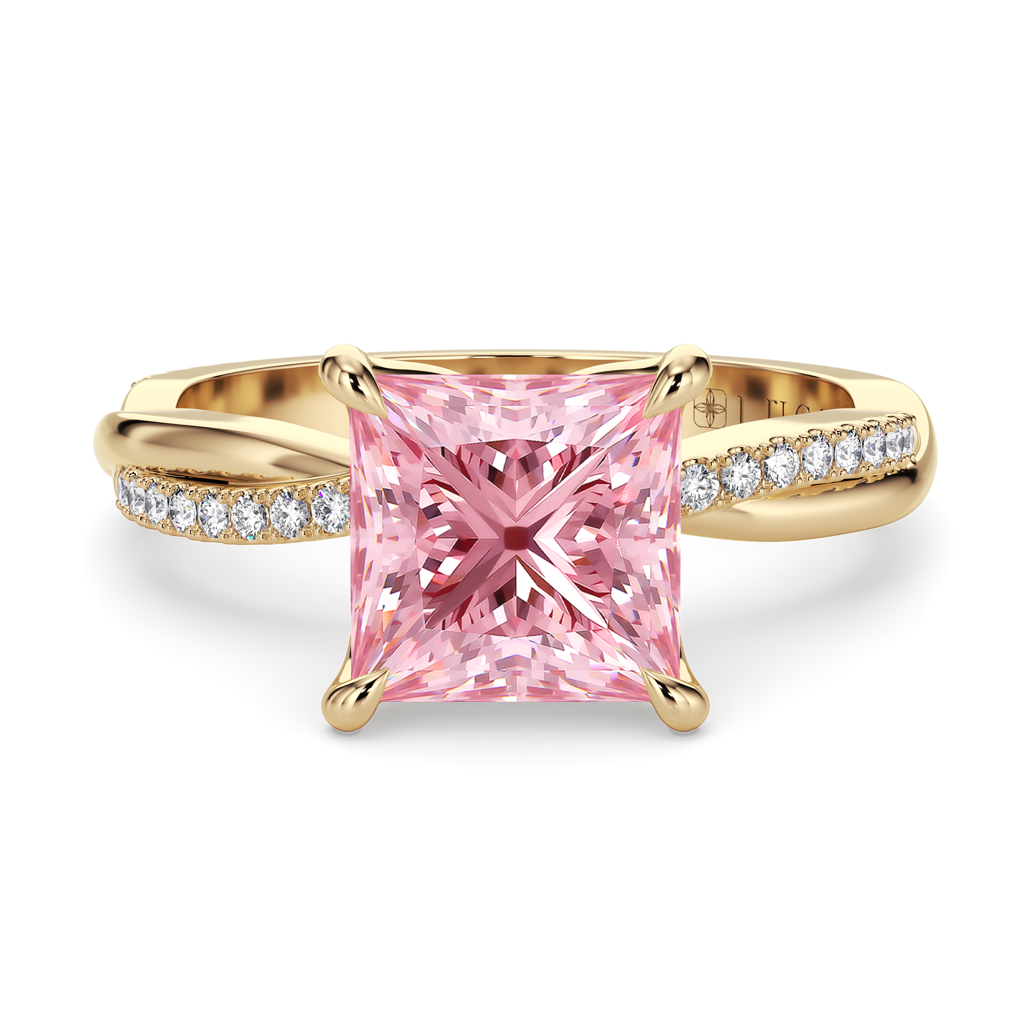 This forever piece features a twisting accented band and Lucce’s signature petal prongs. This princess cut pink diamond engagement ring's vine-like band symbolizes two lives intertwined by love, forming an infinity that speaks of a bond that is unbreakable. Like a delicate flower found in vines, it reflects how you found her, beautiful, one-of-a-kind, and meant to be.