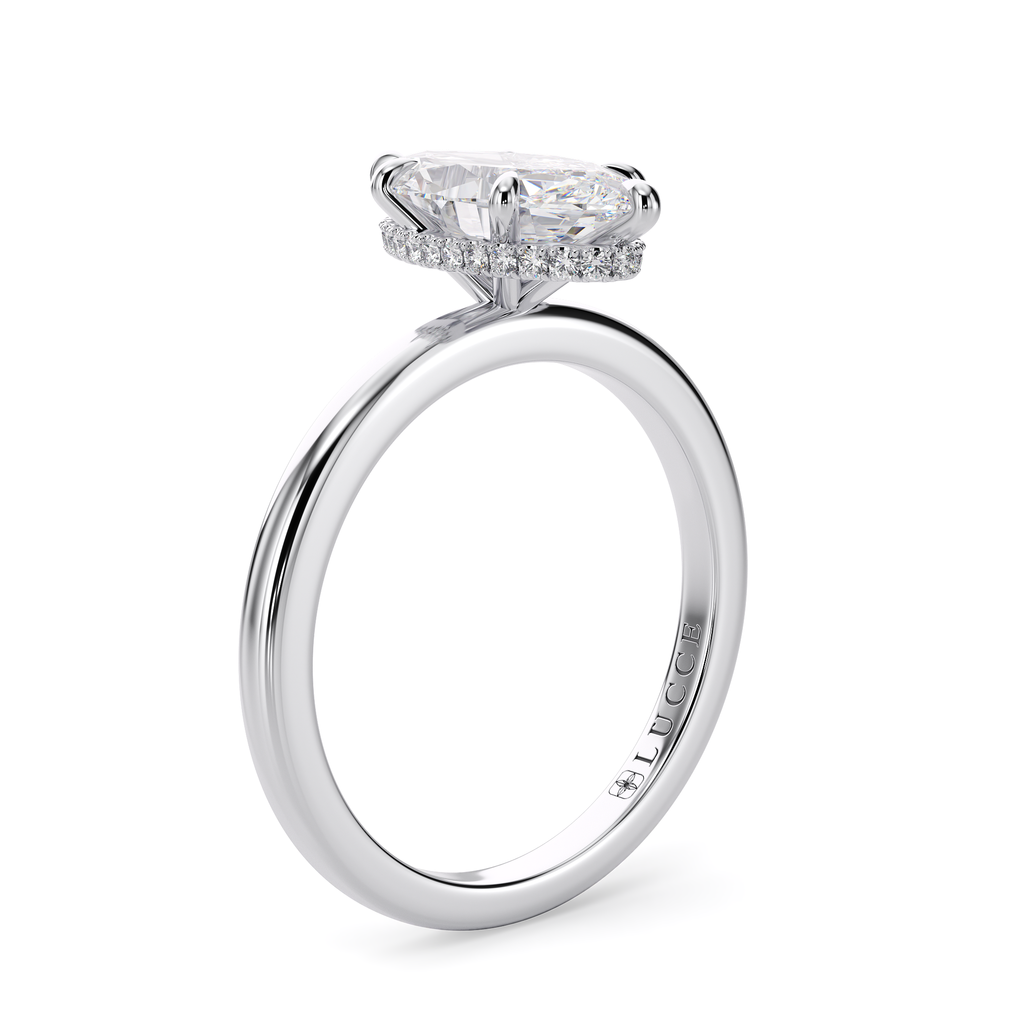 This forever piece features a uniquely wrapped hidden halo and a classic solitaire band. From the top, this marquise cut diamond engagement ring appears simple and elegant, but from another angle, a hidden sparkle is revealed, just like her and the quiet depth of the love you share. The wrapped halo symbolizes your heartfelt promise to keep her safe, embraced in your arms and cherished for all the days to come.