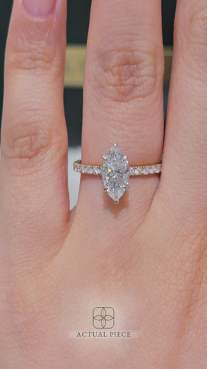 This forever piece features a uniquely wrapped hidden halo and a pavé band. From the top, this marquise cut diamond engagement ring appears simple and elegant, but from another angle, a hidden sparkle is revealed, just like her and the quiet depth of the love you share. The wrapped halo symbolizes your heartfelt promise to keep her safe, embraced in your arms and cherished for all the days to come.