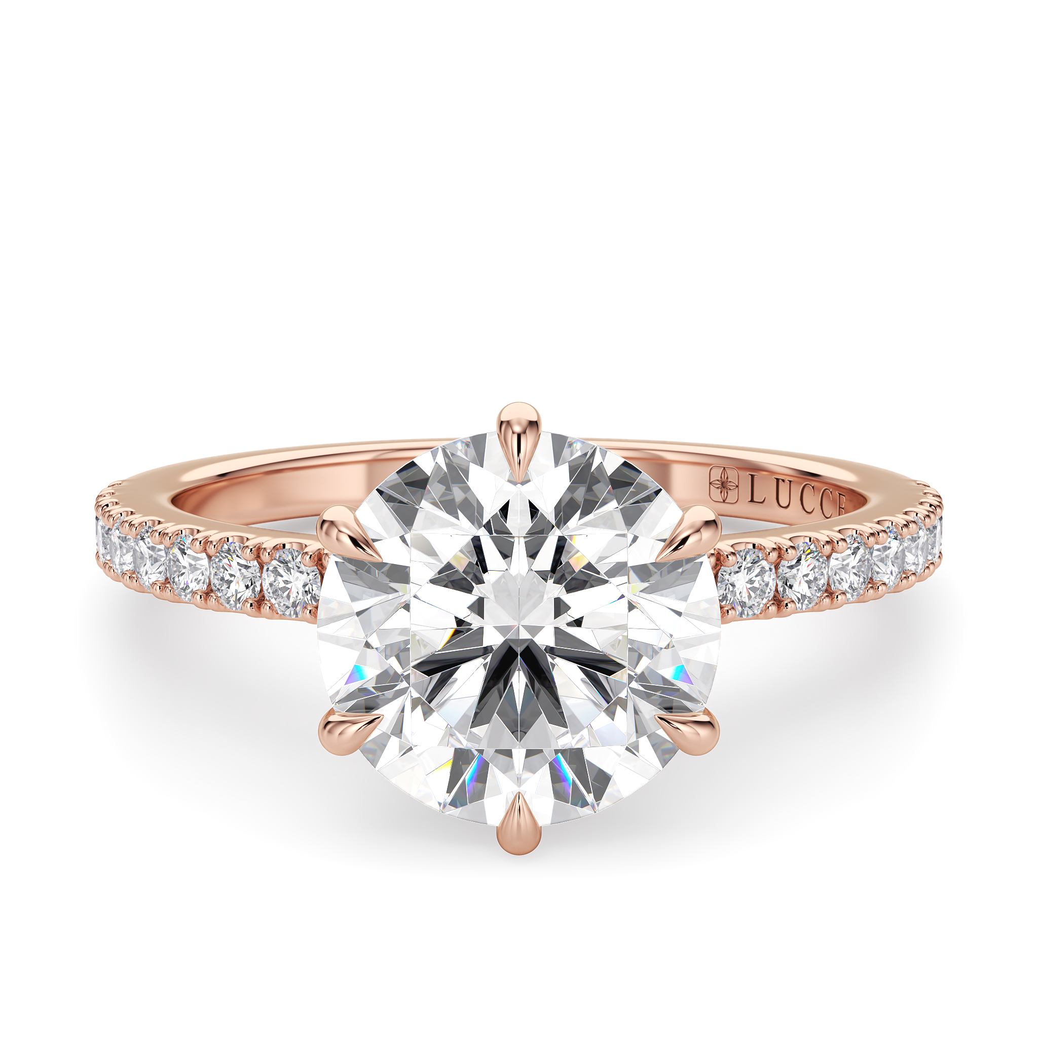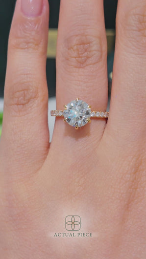 This forever piece features a uniquely wrapped hidden halo and a pavé band. From the top, this round cut diamond engagement ring appears simple and elegant, but from another angle, a hidden sparkle is revealed, just like her and the quiet depth of the love you share. The wrapped halo symbolizes your heartfelt promise to keep her safe, embraced in your arms and cherished for all the days to come.