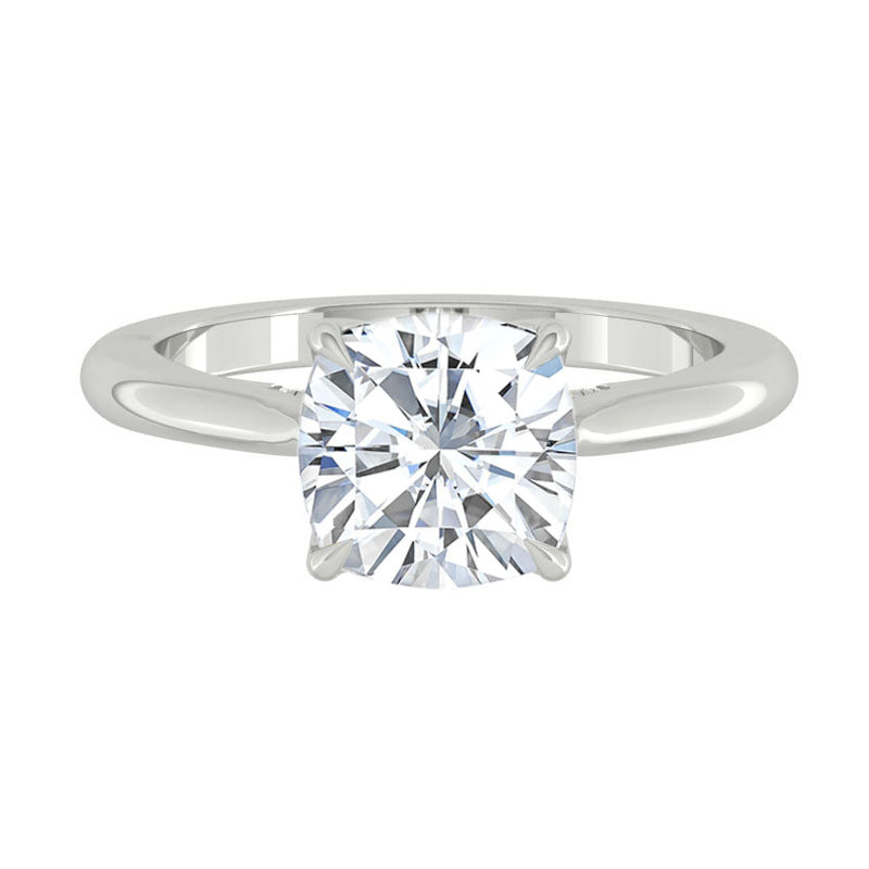 Four petals hug this ring's cushion cut center, while an elegant band extends upward like a cathedral's majestic arches to represent the strength of your relationship. Adding a sparkling surprise are unique accents on the tapered bridge- a 4 petal prong support the most brilliant symbol of a love like yours.