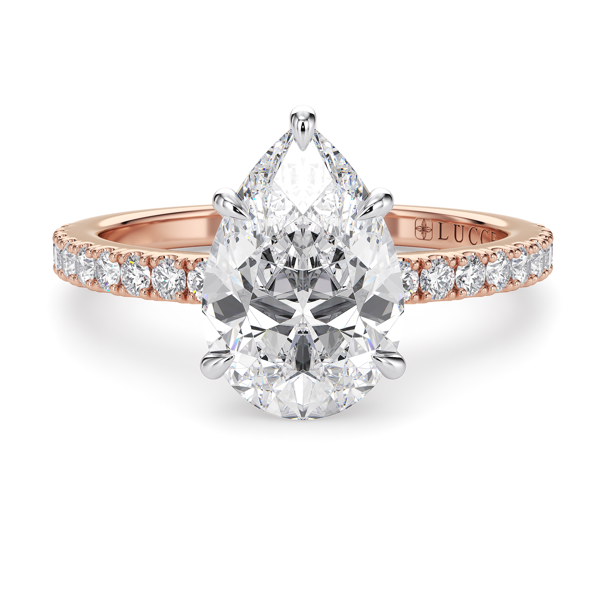 This forever piece features a uniquely wrapped hidden halo and a pavé band. From the top, this pear cut diamond engagement ring appears simple and elegant, but from another angle, a hidden sparkle is revealed, just like her and the quiet depth of the love you share. The wrapped halo symbolizes your heartfelt promise to keep her safe, embraced in your arms and cherished for all the days to come.
