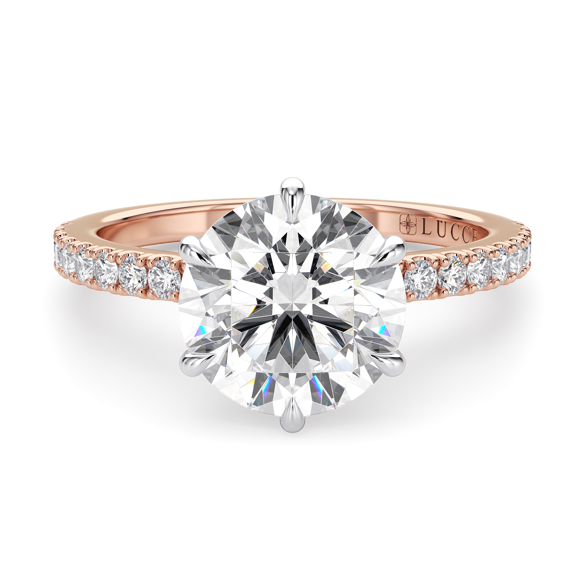 This forever piece features a uniquely wrapped hidden halo and a pavé band. From the top, this round cut diamond engagement ring appears simple and elegant, but from another angle, a hidden sparkle is revealed, just like her and the quiet depth of the love you share. The wrapped halo symbolizes your heartfelt promise to keep her safe, embraced in your arms and cherished for all the days to come.