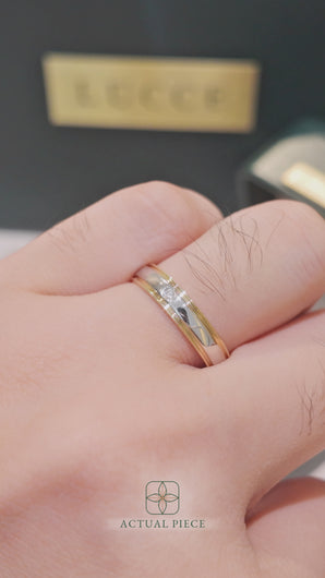 Lucce's Nufelli Mi features a two-tone semi-domed ring, accented by a single sparkling diamond, a beautiful symbol of the unity of two lives. The polished beveled edges catch the light as the diamond shines at its heart—a radiant reminder of your unique bond and enduring love. Elegant and timeless, this ring is a perfect expression of a promise made to last a lifetime.