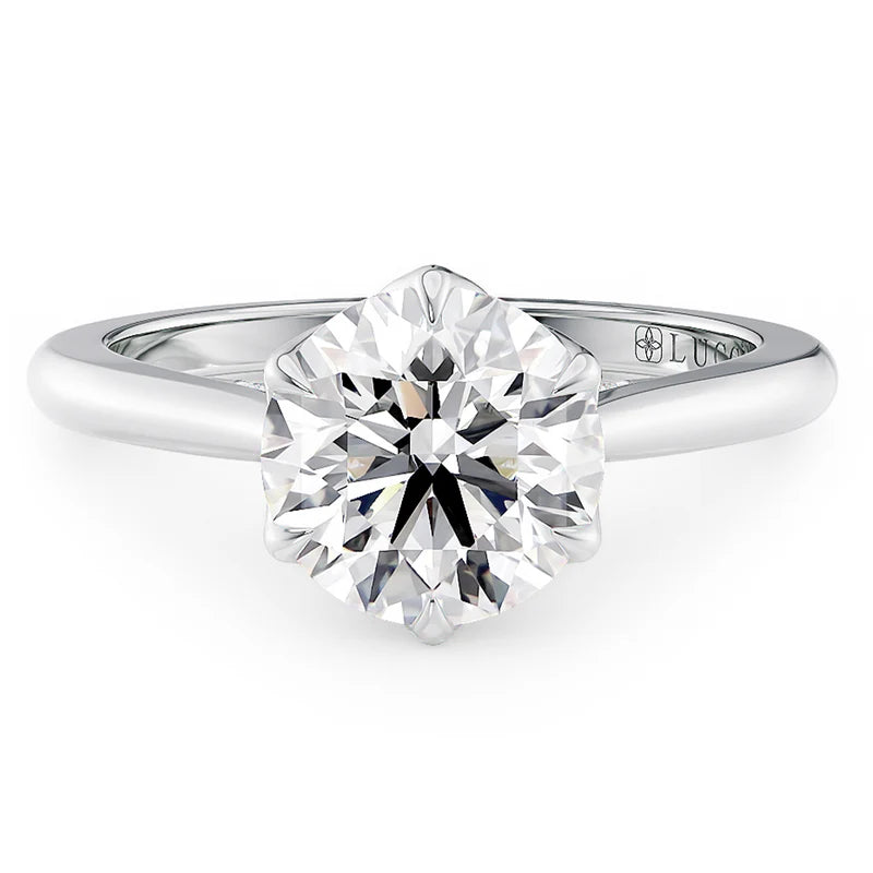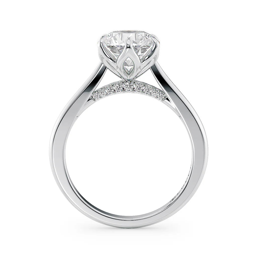 Six petals hug this ring's round cut center, while an elegant band extends upward like a cathedral's majestic arches to represent the strength of your relationship. Adding a sparkling surprise are unique accents on the tapered bridge to support the most brilliant symbol of a love like yours.